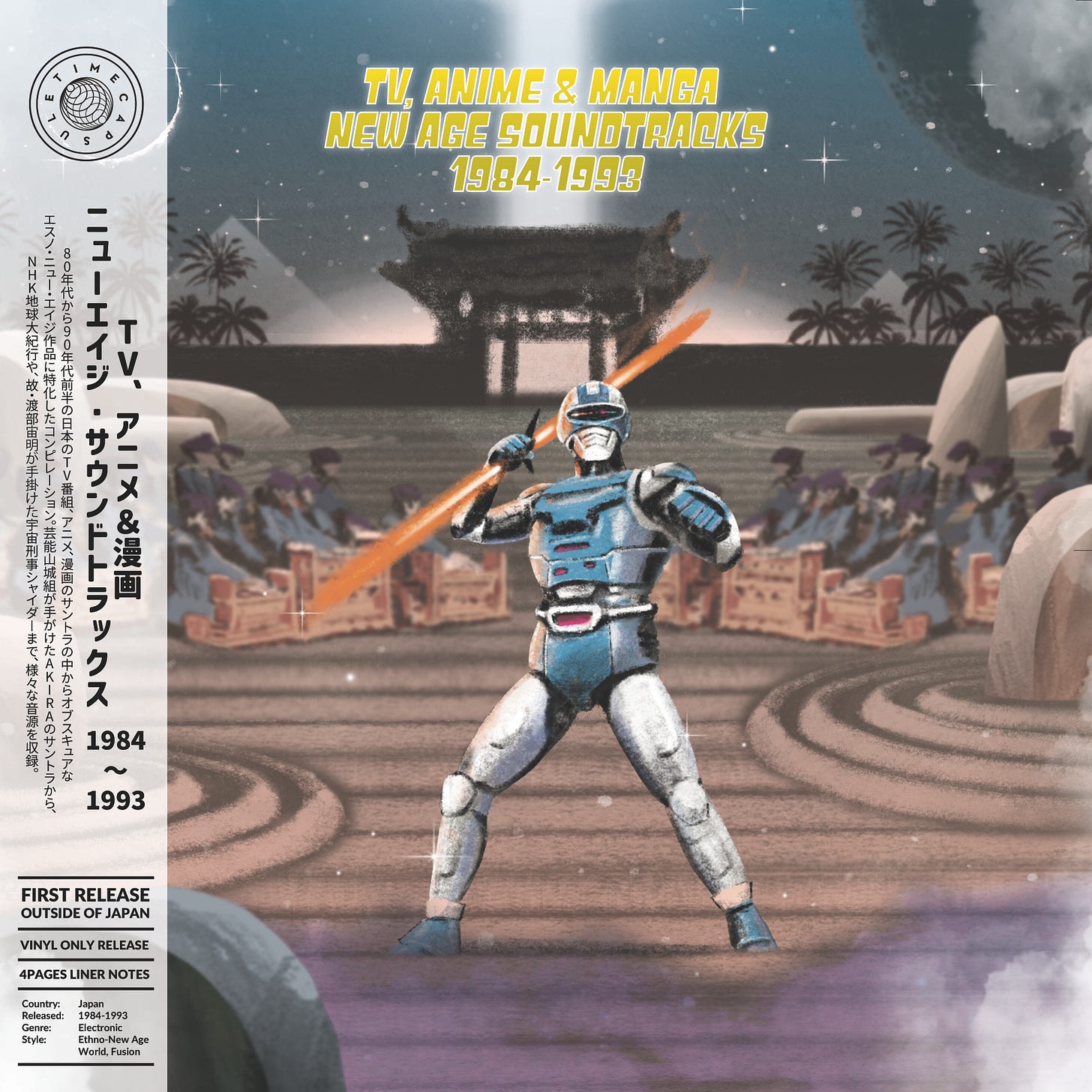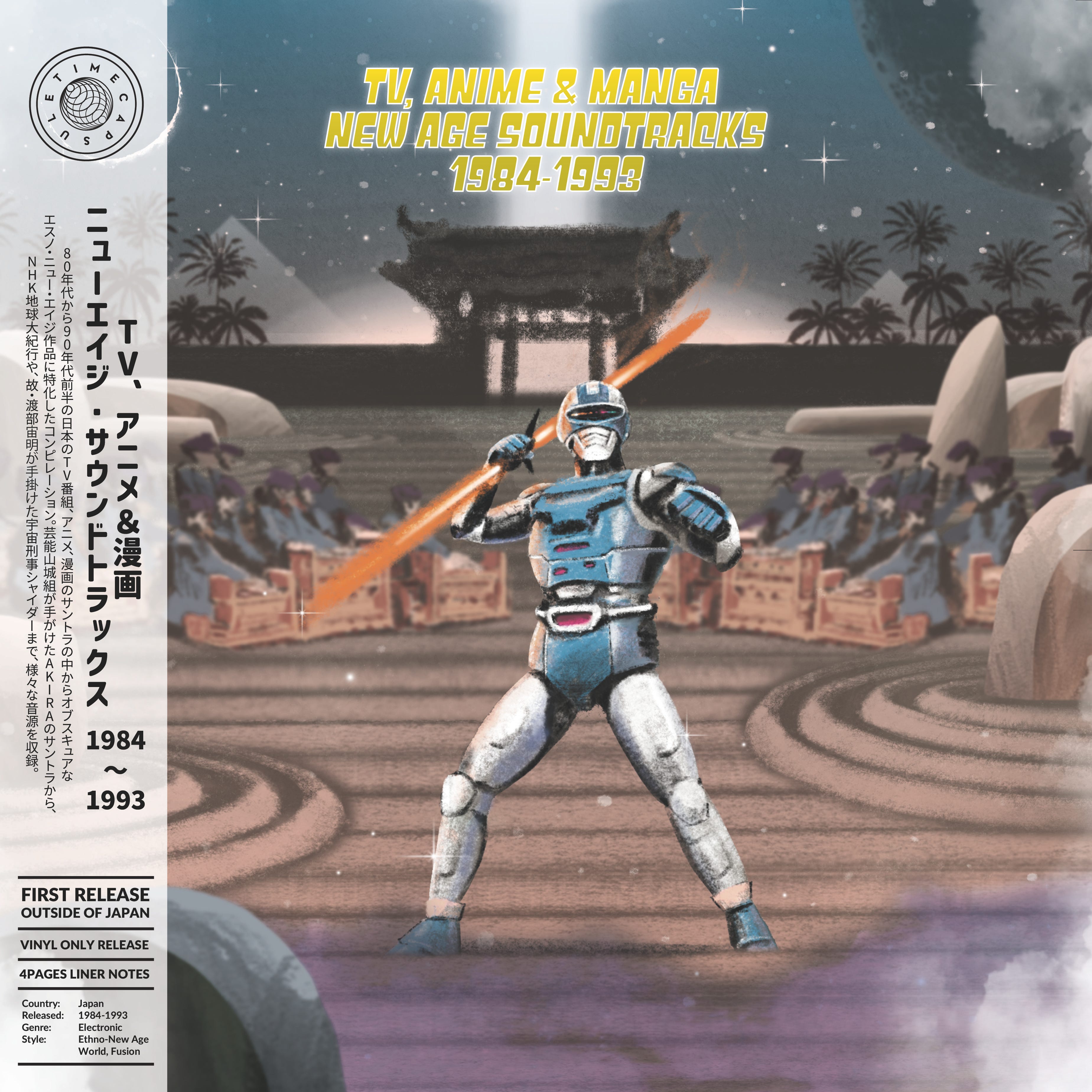 この遺産に敬意を表し、Time Capsule ではアナログ盤限定リリース 『TV, Anime & Manga New Age Soundtracks 1984-1993』を2025年4月25日に発売。当時のTV、アニメ、漫画のサントラの中からこの時代を象徴するニュー・エイジ音楽を8曲選出。芸能山城組による「金田のテーマ」を中心に、宇宙刑事シャイダー、NHK地球大紀行、孔雀王まで、バブル期日本における様々な映像や画像を彩ったスピリチュアルでエスニックな香りのする音源を収録した。