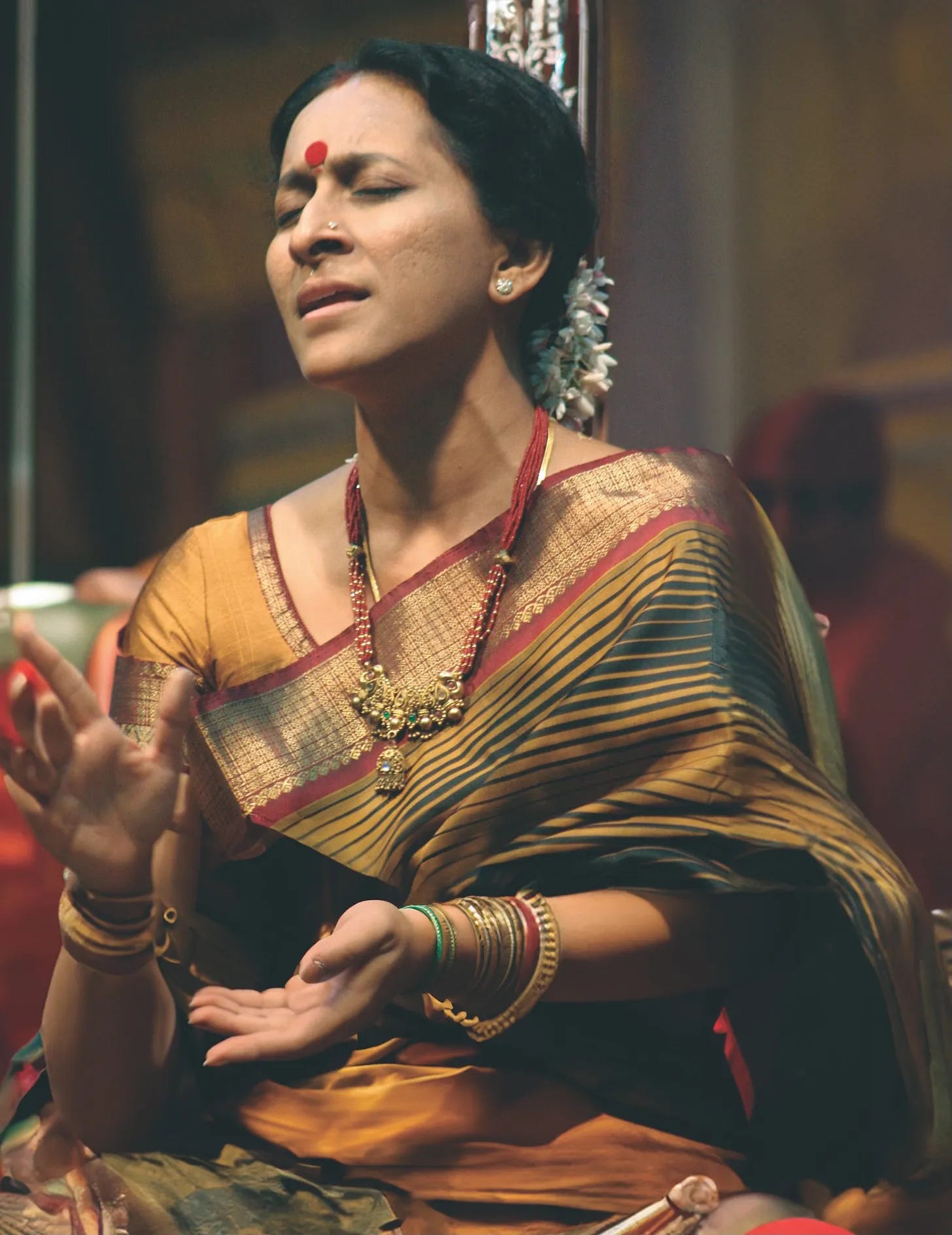 このようなコンセプトを具現化できるアーティストがいるとすれば、ボンベイ・S・ジャヤシュリの歌声しかいなかった。ジャヤシュリは、深い伝承の流れを保ちながらも、魂を揺さぶるような感情を歌い上げる歌い手。彼女の声はシンプルでありながら深い感情を伝えることができ、スピリチュアルで瞑想的な作品に自然と調和する声として知られていた。