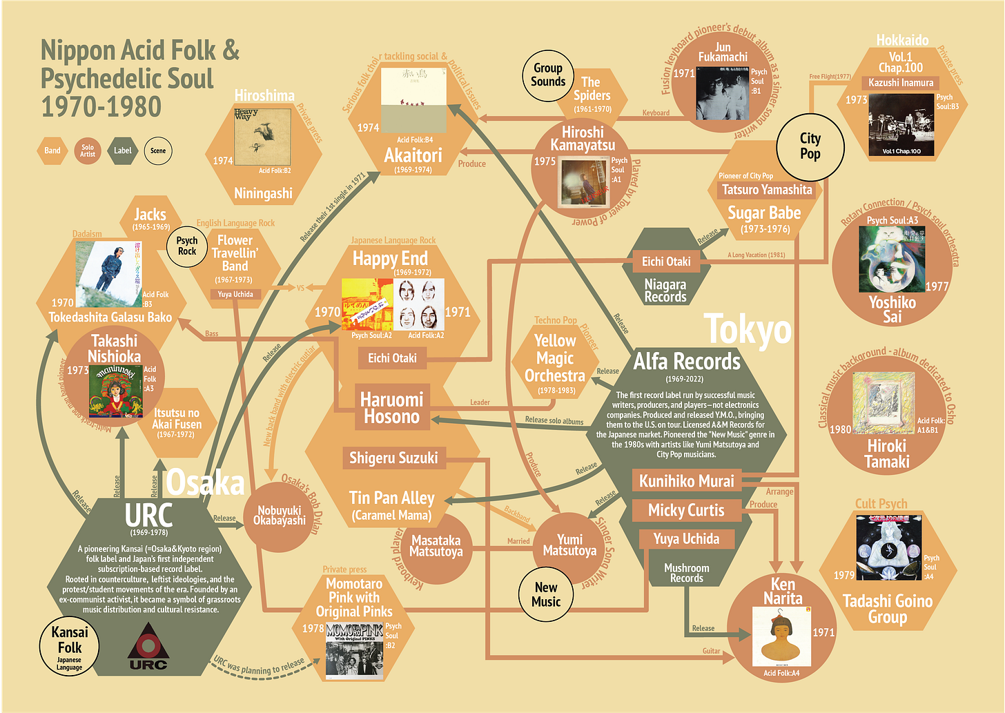2つのコンピレーションに収録されたアーティスト、バンド、レーベル、シーンのつながりを一枚にまとめたマップ。URCを起点とする関西のアシッド・フォークから、東京を拠点に広がるサイケデリック・ソウル、ニュー・ミュージック、テクノ・ポップへの流れまで。1970年代の日本で、音楽と言葉がどのように混ざり合い、変化していったかを可視化しています。